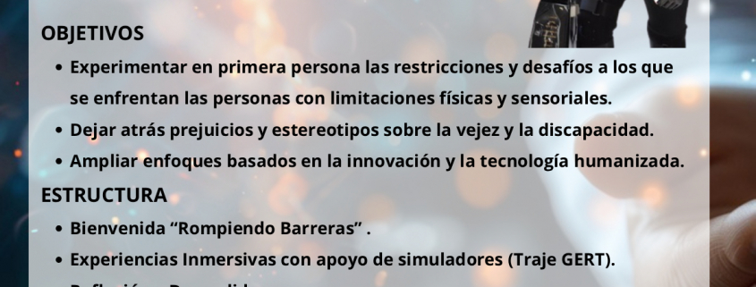 Te invitamos a asistir a una innovadora sesión de “Experimentación de limitaciones para la mejora de la empatía”, una dinámica diseñada para ponernos literalmente en los zapatos de las personas con diversas afecciones y comprender íntimamente sus necesidades y dificultades. Con el apoyo de los innovadores trajes simuladores de edad tendremos la posibilidad de experimentar en primera persona dificultades en la movilidad, en la visión o en la audición, incluso recreando experiencias relacionadas con las demencias.