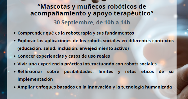 Te invitamos a participar en el taller: “Robótica Terapeútica para profesionales: Mascotas y muñecos robóticos de acompañamiento y apoyo terapéutico, una experiencia formativa única que tendrá lugar en el Hub de Innovación La Aldehuela de Zamora, de forma totalmente gratuita para vuestra entidad, y que está dirigida a profesionales que trabajan en el ámbito de los cuidados, la intervención social y la salud.
