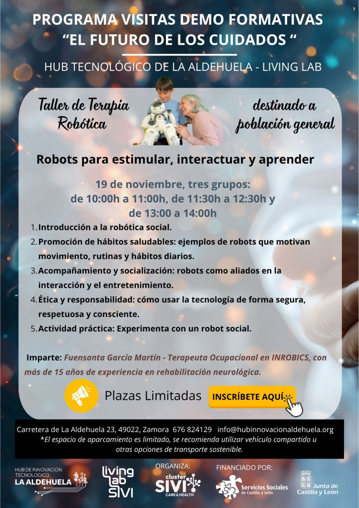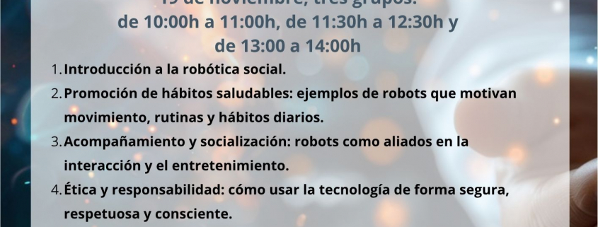 Te invitamos a participar en el taller gratuito “Robots para estimular, interactuar y aprender”, una actividad práctica y divertida pensada para personas de todas las edades interesadas en descubrir cómo la robótica social puede contribuir al bienestar, la estimulación y la vida cotidiana.