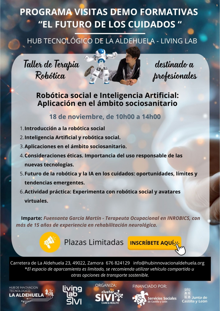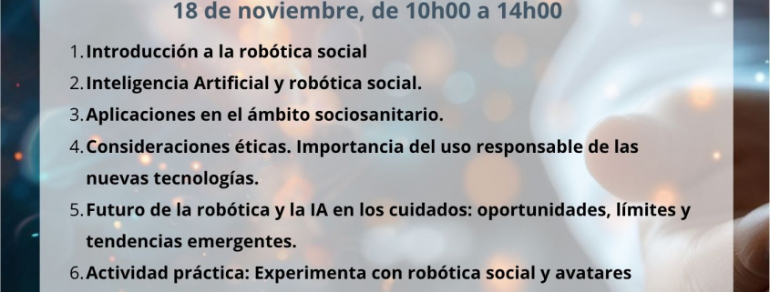 Te invitamos al taller gratuito “Robótica social e Inteligencia Artificial: Aplicación en el ámbito sociosanitario”, una sesión práctica dirigida a profesionales del sector sociosanitario interesados en conocer de primera mano las oportunidades que estas tecnologías ofrecen para mejorar la calidad asistencial, potenciar la autonomía y fomentar el bienestar de las personas usuarias.
